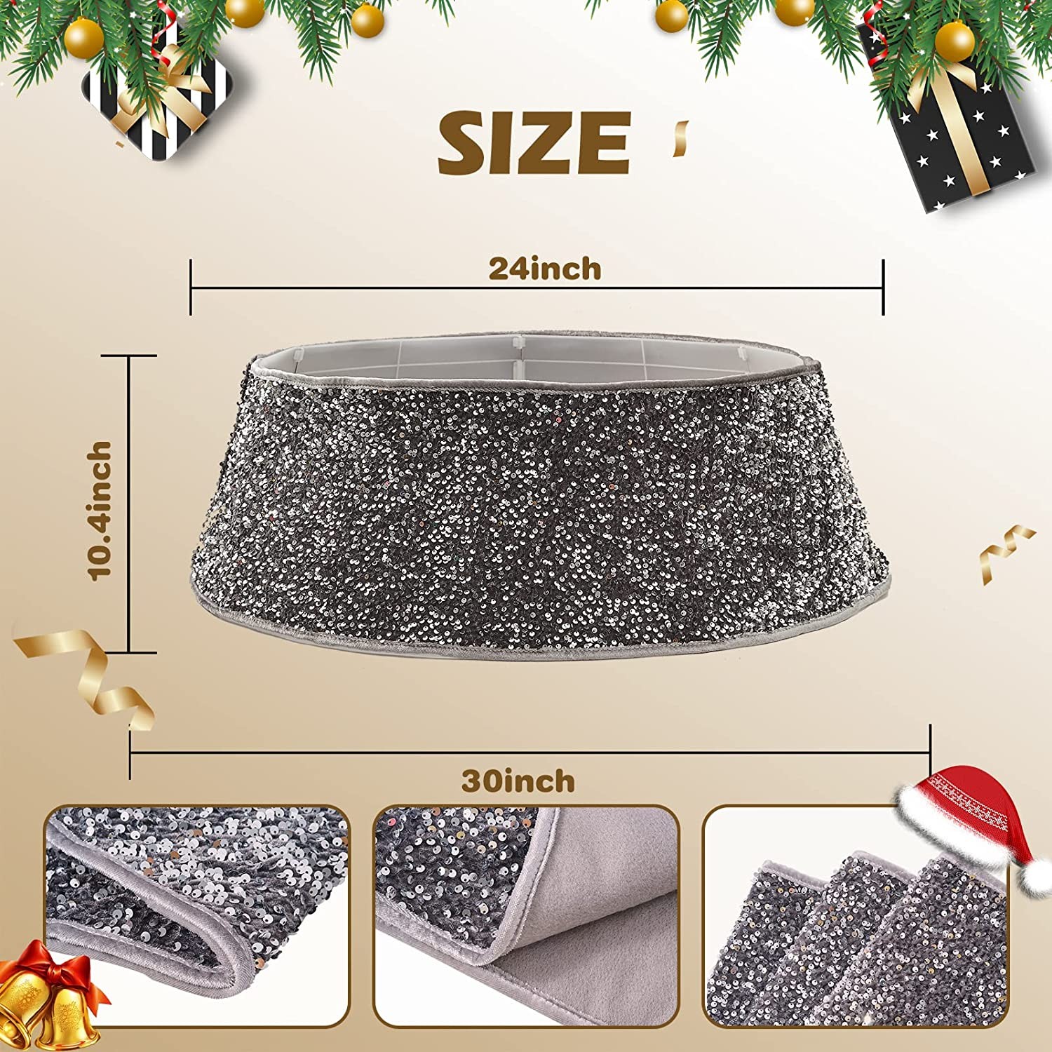 • Dimensions: 16 inch (top) diam. x 20 inch (bottom) diam. x 9.45 H inch. Note: We suggest that you measure your Christmas Tree stand to ensure its fit within the Christmas tree skirt.