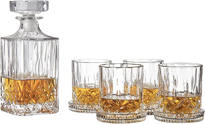 Sendimic 9 Piece Vintage Whiskey Dispenser 4 Coasters Unique Luxury Black Gift Box for Whiskey, Scotch, Bourbon, Rum and More
