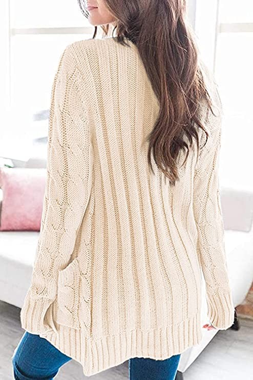 YACUN Women's Cable Knit Cardigan Long Sleeve Button Down Sweater with Pocket Knit, Beige, Small